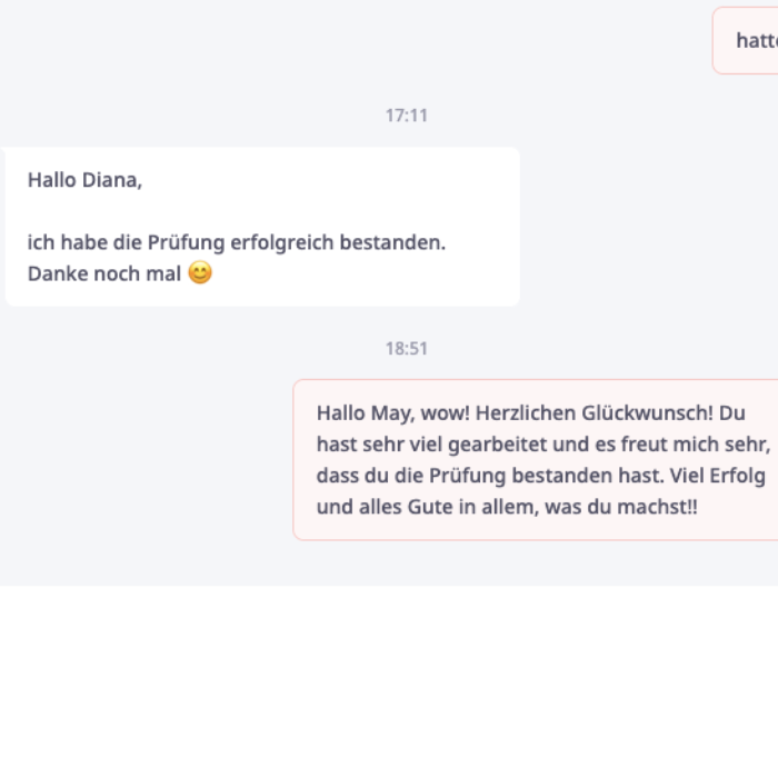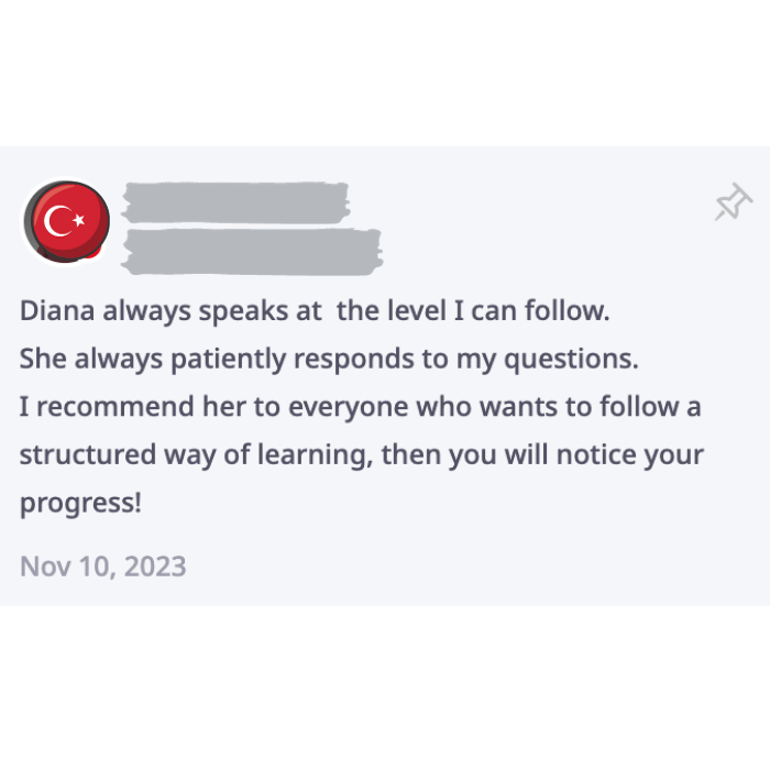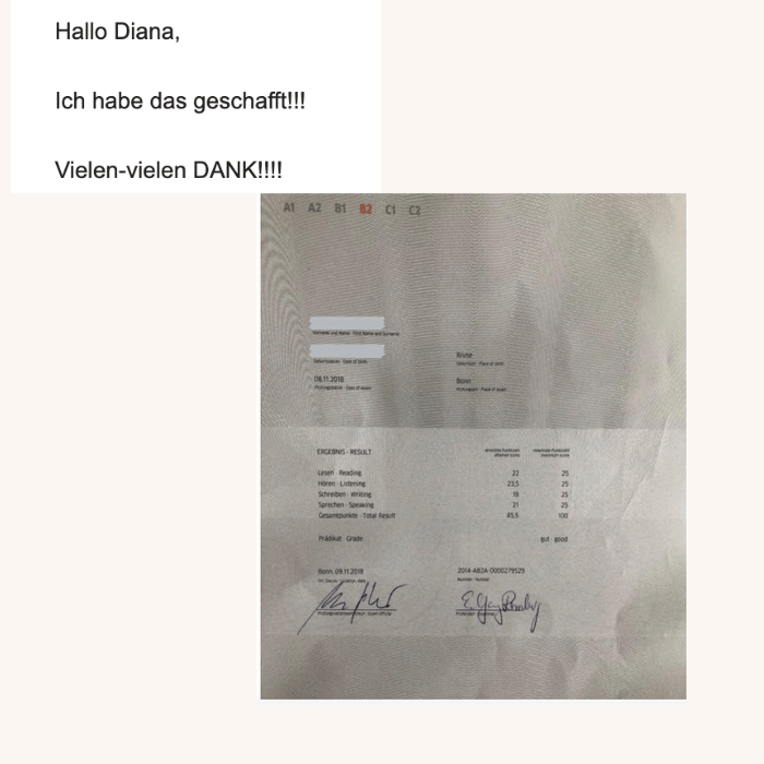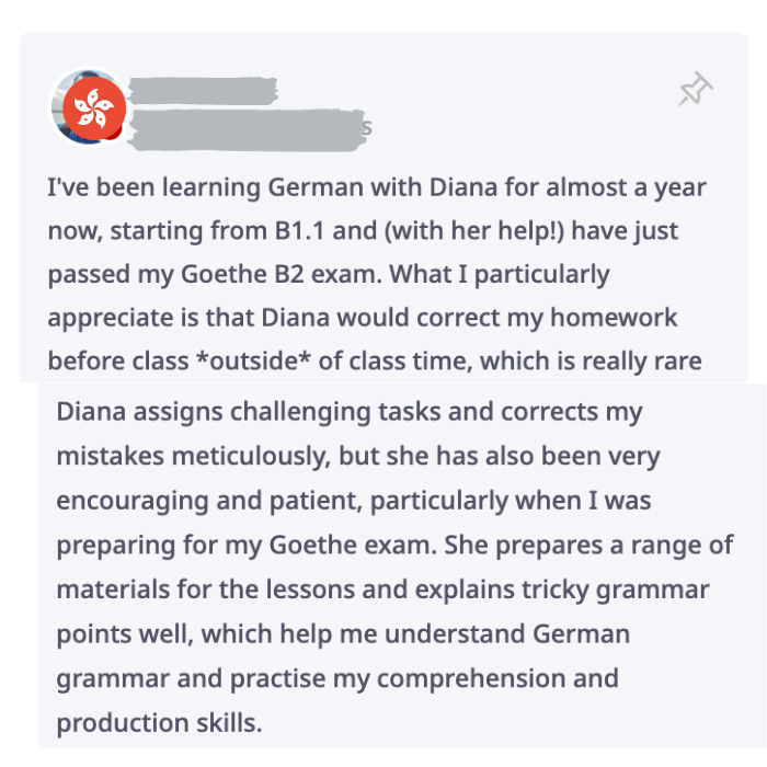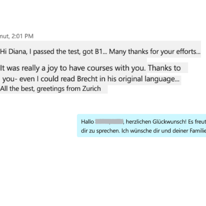 I needed German when I moved to Berlin for work. I started learning it with Diana. At the time, I could hardly speak any German words and was a little bit skeptical about online learning. Now, however, I have already passed the Goethe B2 test and have hardly any problem speaking German in daily conversations. Diana gave me the tools to improve it. Vielen Dank!
